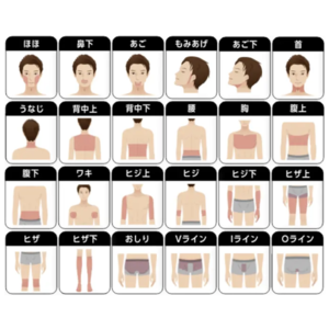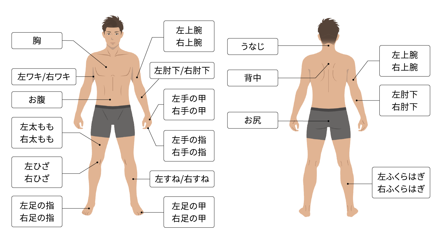 胸、左ワキ/右ワキ、お腹、左太もも/右太もも、左ひざ/右ひざ、左すね/右すね、左足甲.右足甲、左足指/右足指、うなじ、背中、左上腕/右上腕、左膝下/右膝下、左手甲/右手甲、左手指/右手指、お尻、左ふくらはぎ/右ふくらはぎ