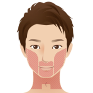 ひたい、頬、鼻筋、もみあげ、鼻下、アゴ、アゴ下、首