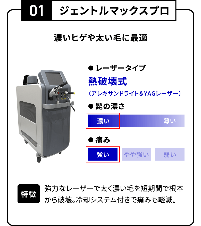 レジーナクリニック オムでは、施術する部位によって3種類の医療レーザー脱毛機を使い分けています。さらに今注目のジェントルマックスプロを使用!肌質や毛質に合わせた施術でしっかり効果を実感できます。