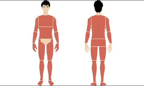 胸、腹、背中、ワキ、二の腕、肘〜手首、手の甲・手指、太腿、ひざ〜足首、足の甲・足指