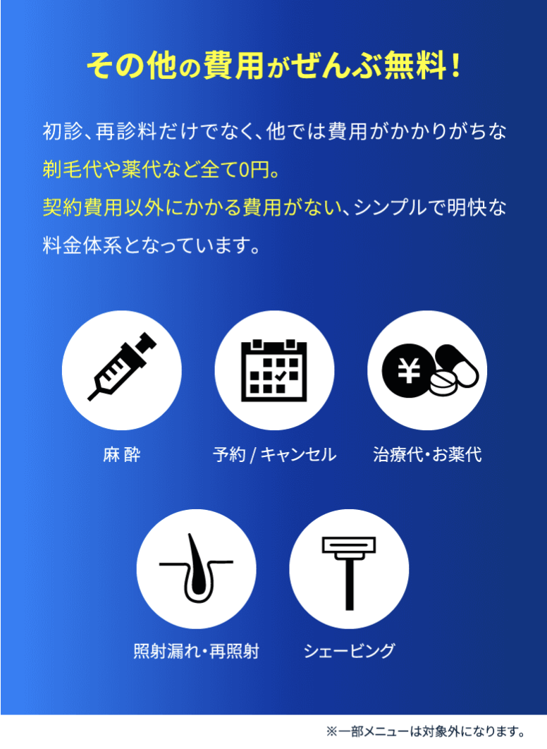 - エミナルクリニックメンズは初診料/再診料、各処置料、カウンセリング料、ローション代金、転院手続き費用、お薬代金、トラブル治療費、テスト照射、週末の追加料金、麻酔料金すべて無料なので、追加料金で想定よりも高くなるなんてことは基本ありません。